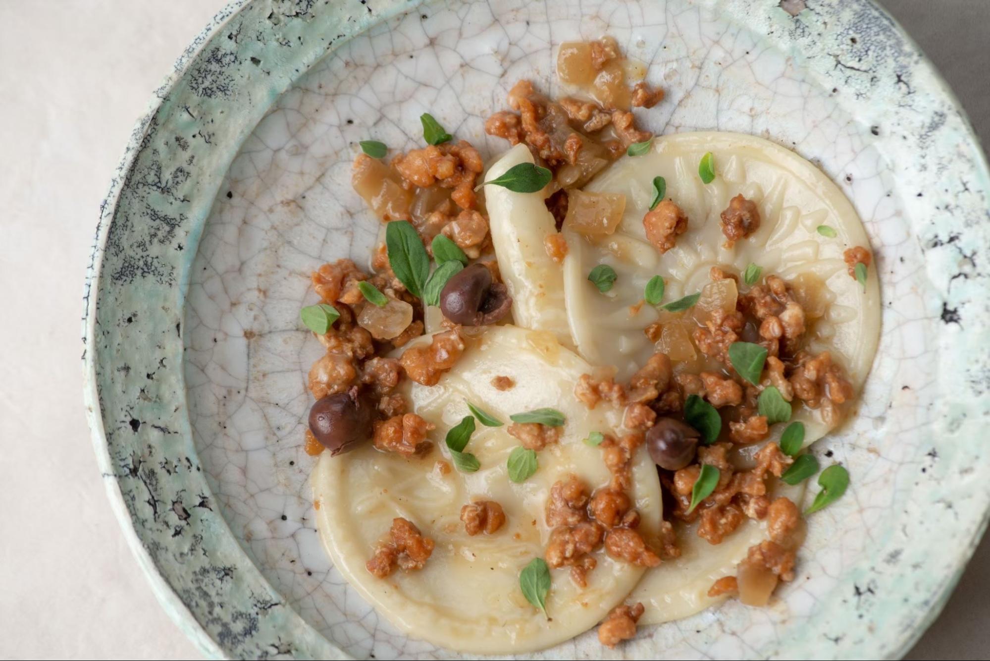 エミリアロマーニャ州ラヴェンナから天然ヒラメを詰めたカペレッティ。モザイクアートが点在する街からのからの食べる芸術。