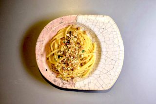 ニンニクと唐辛子、ドライトマトで香りづけしたブカティーニの上にふりかけます。